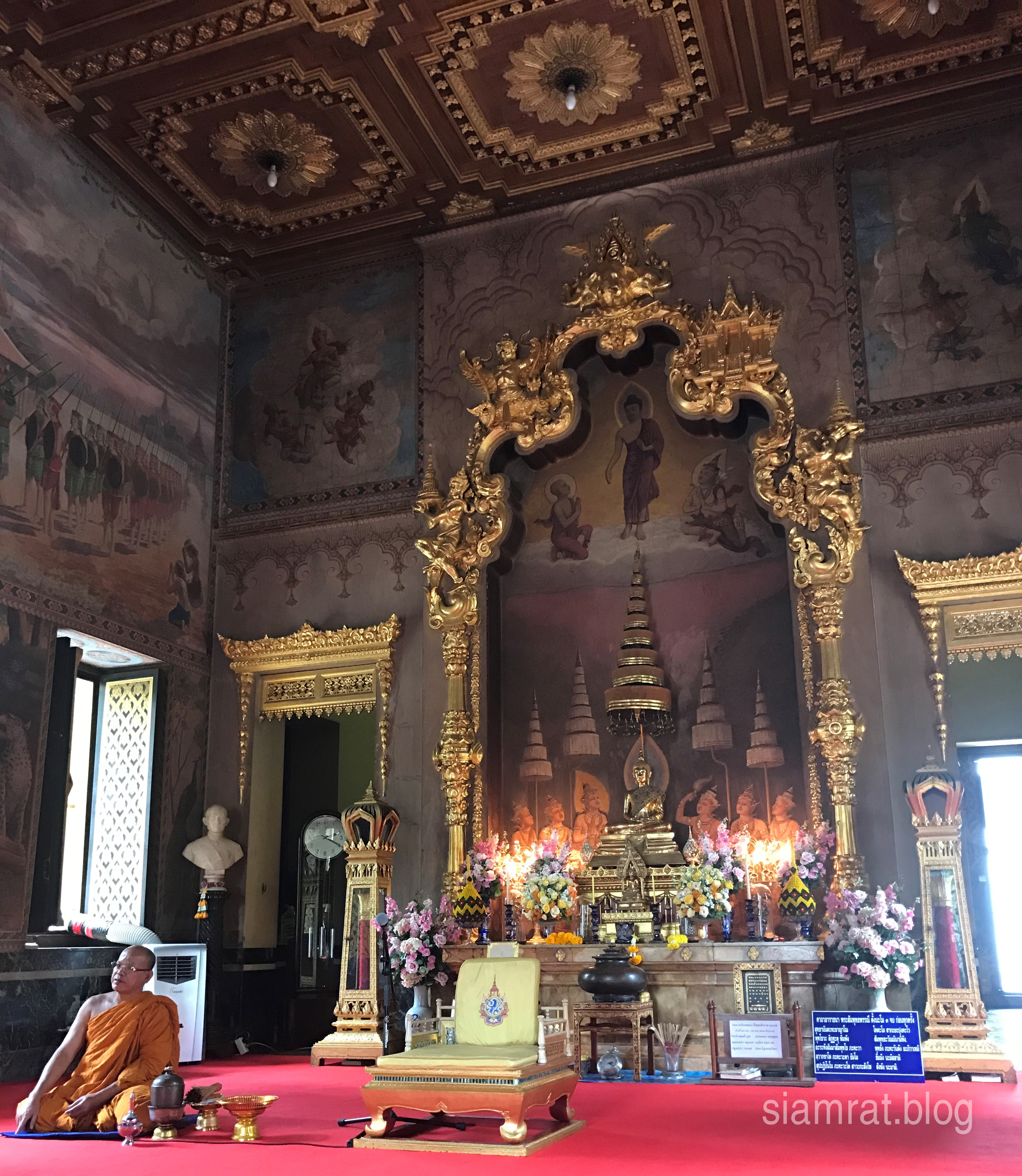One of the most surprising finds I have experienced in Bangkok is the interior of the ordination hall or Ubosot at Wat Rajathiwas Wiharn. This is the temple where King Mongkut (Rama IV) resided as abbot prior to his accession to the throne in 1851. In 1923 his grandson King Vajiravudh (Rama VI) sponsored renovation work at this temple. The ordination hall was retained with its classic Khmer styling, however the interior was renovated with murals by Carlo Rigoli (Who had previously worked with Galileo Chini at the Ananta Samakhom throne hall) working in collaboration with Prince Naris. Traditional Buddhist scenes are presented in magnificent Italian style frescoes.  The result is a breathtaking combination of Italian monumental art with traditional Thai religious iconography.