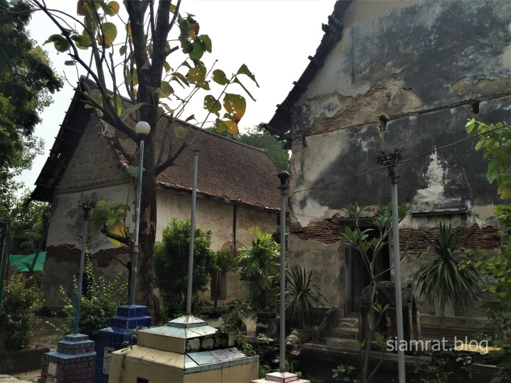 In late 2016 a pair of steel roofs on scaffolding were erected over the uobost and viharn to protect them from the weather. Siamrat is not aware of what further restoration is planned but clearly much more needs to be done to prevent further deterioration of the buildings and the artwork within. One hopes that any work is carried out carefully and sympathetically to the history of these beautiful temple buildings. They are well worth a visit.