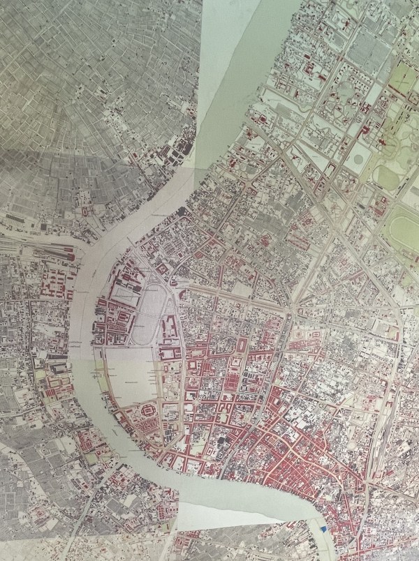 Recently Siamrat came across a large map of Bangkok hanging on the wall of a café. The map was immediately familiar with the old city of Bangkok nestled in the bow of the Chao Phraya River. As I looked for familiar landmarks of the city it was quickly clear that this was not a recent map of the city and I began to wonder what year it belonged to, there being no date printed on it. Then I started to look again, not just for the landmarks that are familiar but for the landmarks that were missing, the map pre-dating them.